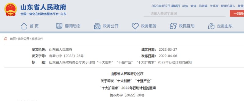 山東省人民政府辦公廳關(guān)于印發(fā)“十大創(chuàng)新”“十強(qiáng)產(chǎn)業(yè)”“十大擴(kuò)需求”2022年行動(dòng)計(jì)劃的通知