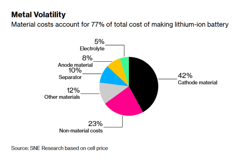 Oh在會(huì)議間隙告訴彭博社,雖然韓國電池制造商沒有透露可能會(huì)提價(jià)多少,但那些使用鋰、鎳、鈷和錳的公司可能會(huì)在2025年前將電池組的價(jià)格提高40%。