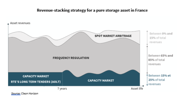 在法國,有兩個替代市場可以提高儲能系統(tǒng)的盈利能力:容量市場和頻率調(diào)節(jié)市場。在任何時間點,儲能系統(tǒng)都可以在現(xiàn)貨市場上進行套利,也可以在這些市場中運作——無論對電池儲能系統(tǒng)來說都有利可圖。
