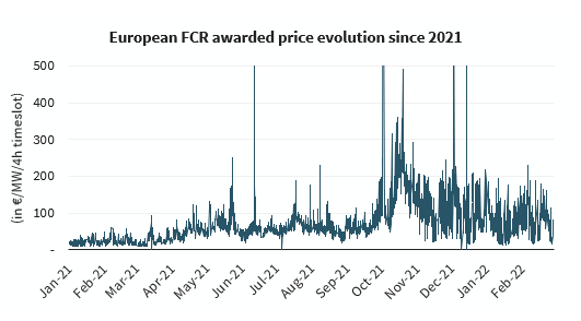 (2)頻率調(diào)節(jié)市場由一次性承諾組成的,即在一年中的任何一天的特定時間段內(nèi)遵循電網(wǎng)系統(tǒng)的操作指令(頻率遏制服務的持續(xù)時間為四個小時,自動頻率恢復儲備服務的持續(xù)時間為1小時)。相關(guān)收入通過管理平臺上的拍賣系統(tǒng)確定。因此,已經(jīng)承諾進入容量市場的儲能系統(tǒng)能夠在提供這些服務的時間之外進行投標。在2021年1月至2022年2月期間,頻率遏制服務的價格變化很大,4小時的可用性從100歐元/MW到1,600歐元/MW不等。