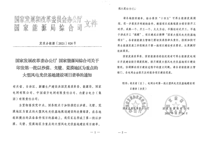 2021年11月24日,《第一批以沙漠、戈壁、荒漠為重點的大型風電光伏基地建設項目清單》下發(fā)。