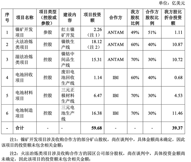 具體來看,6個子項目分別圍繞鎳礦開采和電池生產(chǎn)兩大塊。其中,與ANTAM合作的三個項目為鎳礦開發(fā)、火法冶煉類、濕法冶煉類,與IBI合作的三個項目為電池回收、電池材料和電池制造。除了鎳礦開發(fā)項目外,其余5個項目均由寧德時代控股。上述項目建設(shè)周期為5年。