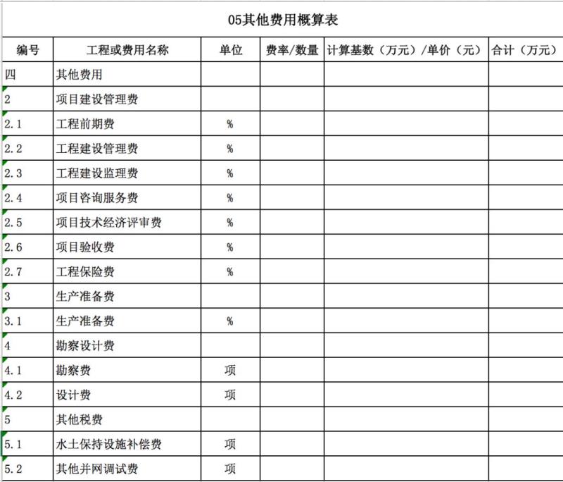包含:工程前期費、管理費、監(jiān)理費、保險費、驗收費、生產(chǎn)準備金等等費用。如下表所示。