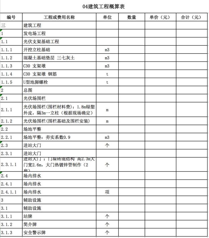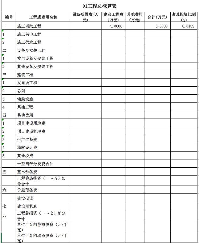 包含:發(fā)電廠區(qū)工程、變電站工程、房屋工程、交通工程等費用。如下表所示。