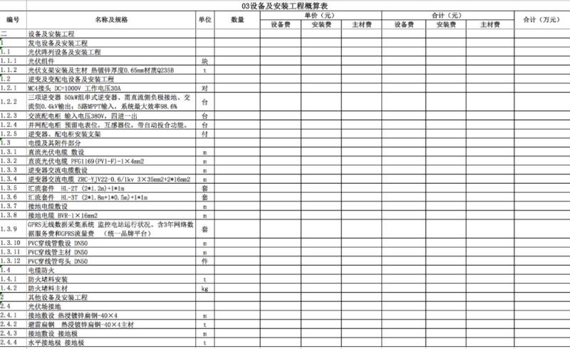 包含:發(fā)電設(shè)備(組件、逆變器、支架、電纜、接地)、升壓變電站設(shè)備、通信設(shè)備及其他設(shè)備的購買及安裝費用。如下表所示。(某電站的電氣設(shè)備項目附后)