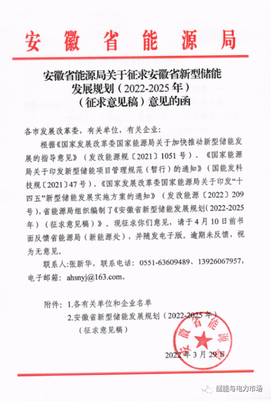 中國儲能網(wǎng)訊:近日,安徽省能源局發(fā)布《安徽省新型儲能發(fā)展規(guī)劃(2022-2025)》(征求意見稿)(以下簡稱《規(guī)劃》)。依據(jù)《規(guī)劃》,到2025年安徽省將實現(xiàn)新型儲能裝機(jī)規(guī)模300萬千瓦以上。