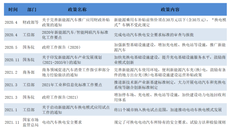 在2020年5月國(guó)務(wù)院發(fā)布的《政府工作報(bào)告》中,關(guān)于新基建的內(nèi)容由“建設(shè)充電樁”擴(kuò)展為“增加充電樁、換電站等設(shè)施”,這是換電站第一次被寫(xiě)入政府工作報(bào)告,亦是換電站首次被納入新型基礎(chǔ)設(shè)施行列,成為我國(guó)新基建的七大重要領(lǐng)域之一。此后,多份政府文件均提出大力發(fā)展換電模式。
