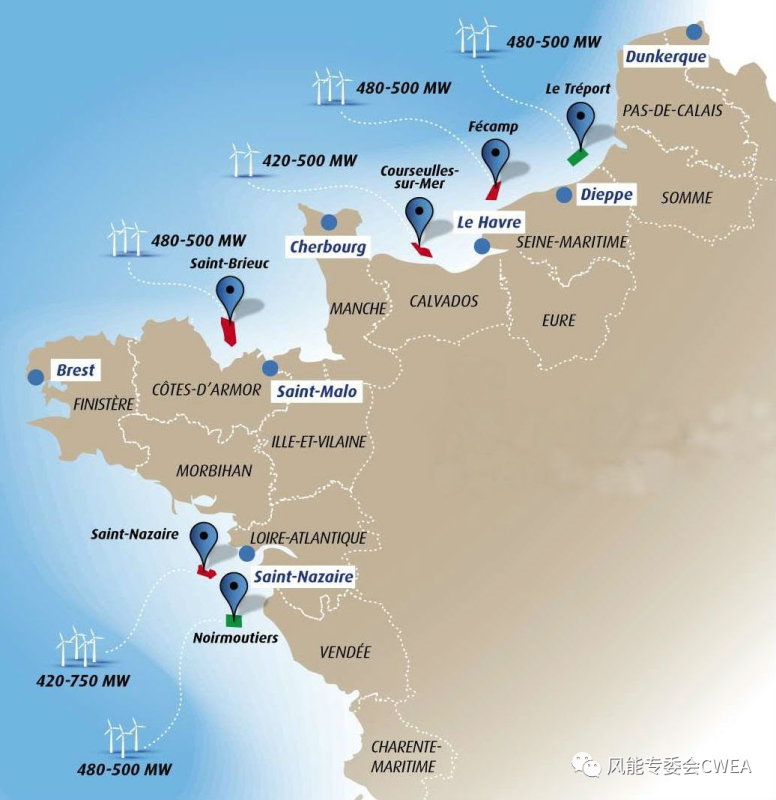 法國海上風(fēng)電地圖,左下角紅色Saint Nazaire今年將上線