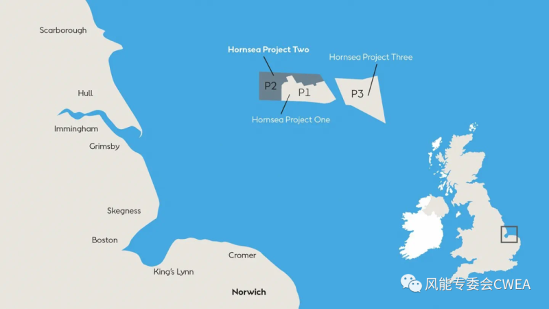 Hornsea 2(P2)位置示意圖,毗鄰格里姆斯比港(Grimsby)和赫爾港(Hull)