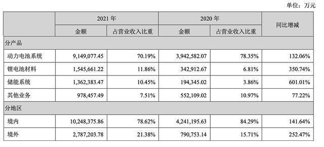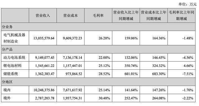 財(cái)報(bào)顯示,寧德時(shí)代核心業(yè)務(wù)分為動(dòng)力電池系統(tǒng)、鋰電池材料和儲(chǔ)能系統(tǒng)等;去年動(dòng)力電池系統(tǒng)營(yíng)業(yè)收入為914.9億元,同比增長(zhǎng)132.06%,占總營(yíng)業(yè)收入比重超7成;鋰電池材料和儲(chǔ)能系統(tǒng)營(yíng)業(yè)收入分別同比增長(zhǎng)超3.5倍、6倍至154.6億元、136.2億元。此外,去年寧德時(shí)代海外市場(chǎng)業(yè)務(wù)也實(shí)現(xiàn)了高速增長(zhǎng),營(yíng)業(yè)收入為278.7億元,同比增長(zhǎng)2.5倍;營(yíng)收占比由去年同期的15.71%增長(zhǎng)至221.38%,境外毛利率為30.48%,高于境內(nèi)。