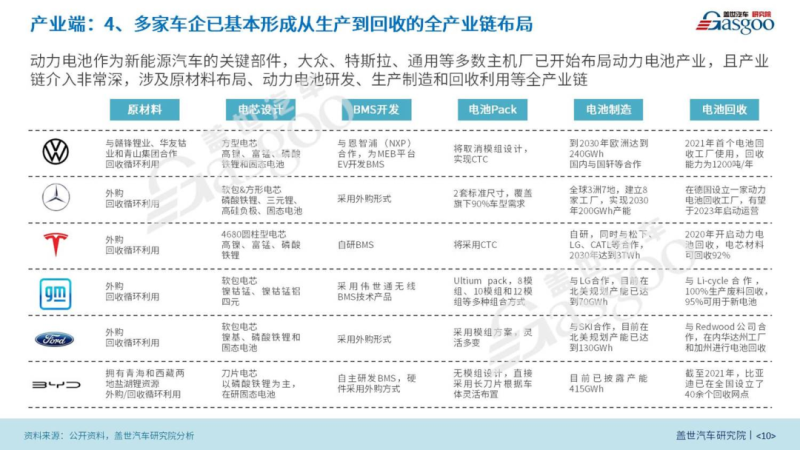 最后,通過對(duì)主流車企動(dòng)力電池的產(chǎn)業(yè)布局追蹤發(fā)現(xiàn),目前多家主流車企已基本形成從原材料、動(dòng)力電池研發(fā)、生產(chǎn)制造到回收利用的全產(chǎn)業(yè)鏈布局。以大眾為例,雖然其電動(dòng)化來得不快,但圍繞電動(dòng)化的相關(guān)布局其實(shí)一點(diǎn)也不慢,而是走在了傳統(tǒng)車企的前列。如在原材料方面,大眾已深入布局鎳和鈷以及鋰等三元電池核心原材料;在電池開發(fā)方面,大眾將推出一款“Unified Cell”標(biāo)準(zhǔn)化方形電芯,應(yīng)用磷酸鐵鋰、高錳、三元鋰和固態(tài)電池四種材料,按照成本和性能要求分別搭載入門、主流和高性能三種車型,預(yù)計(jì)到2030年將搭載旗下80%車型,同時(shí)到2030年歐洲要建立240GWh動(dòng)力電池生產(chǎn)基地;在回收端,大眾首個(gè)電池回收工廠薩爾茨吉特已投入使用,采用高度自動(dòng)化的機(jī)械制備和濕法冶金方式回收工藝,年回收能力達(dá)到1200噸,能有效補(bǔ)充大眾對(duì)動(dòng)力電池原材料的需求。