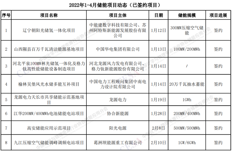中國儲能網(wǎng)訊:據(jù)中國化學(xué)與物理電源行業(yè)協(xié)會儲能應(yīng)用分會產(chǎn)業(yè)政策研究中心不完全統(tǒng)計,2022年1-4月以來,主要儲能項目簽約達(dá)20個,規(guī)模超10GWh。簽約項目類別包括:壓縮空氣儲能、電化學(xué)儲能、抽水蓄能、氫儲能等。