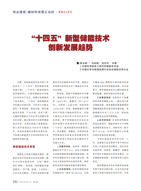 近期,國家能源局和有關部門先后發(fā)布了《“十四五”新型儲能發(fā)展實施方案》、《“十四五”能源領域科技創(chuàng)新規(guī)劃》,為新型儲能技術(shù)創(chuàng)新方向和技術(shù)產(chǎn)業(yè)化、規(guī)模化發(fā)展提供了指導意見。“十四五”新型儲能技術(shù)發(fā)展以創(chuàng)新引領、示范先行為基本原則,補強短板,鍛造長板,推動儲能技術(shù)革新、產(chǎn)業(yè)升級、成本下降,支撐新型儲能從示范應用向規(guī)模市場化的發(fā)展。通過推動多元化新型儲能技術(shù)開發(fā),實現(xiàn)創(chuàng)新能力顯著提高、核心技術(shù)裝備自主可控水平大幅提升、標準體系基本完善的發(fā)展目標,為構(gòu)建以新能源為主體的新型電力系統(tǒng)提供關鍵支撐。