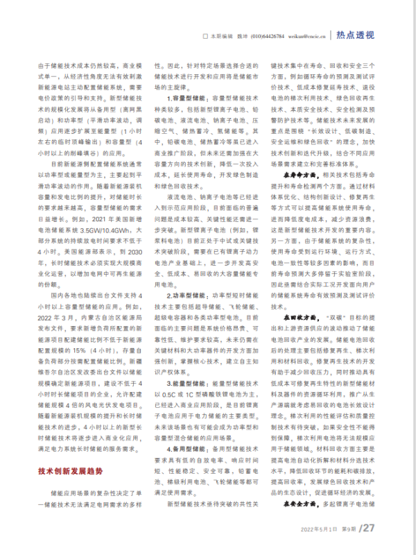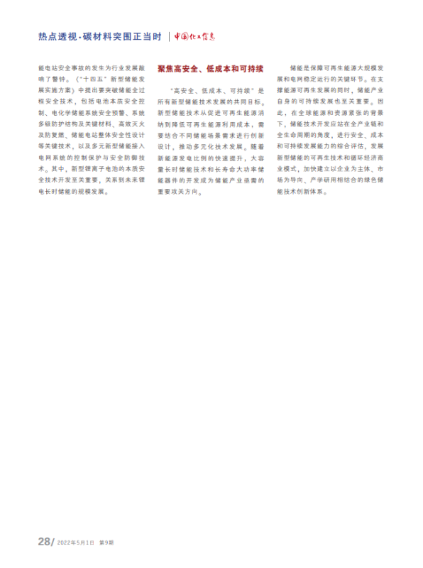 “高安全、低成本、可持續(xù)”是所有新型儲能技術(shù)發(fā)展的共同目標。新型儲能技術(shù)從促進可再生能源消納到降低可再生能源利用成本,需要結(jié)合不同儲能場景需求進行創(chuàng)新設計,推動多元化技術(shù)發(fā)展。隨著新能源發(fā)電比例的快速提升,大容量長時儲能技術(shù)和長壽命大功率儲能器件的開發(fā)成為儲能產(chǎn)業(yè)亟需的重要攻關方向。