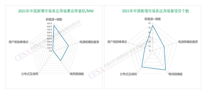 圖表3–8 2021年中國新增電化學(xué)儲能市場功率裝機(jī)及項(xiàng)目個數(shù)分布