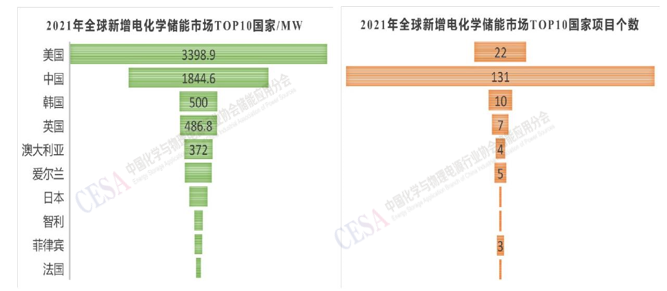 2021年,全球新增電化學(xué)儲能市場TOP10國家依次是:美國(3398.9 MW)、中國(1844.6 MW)、韓國(500 MW)、英國(486.8 MW)、澳大利亞(372 MW)、愛爾蘭(354.5 MW)、日本(240.0 MW)、智利(112.0 MW)、菲律賓(100.0 MW),法國(61 MW)、十個國家電化學(xué)儲能項(xiàng)目個數(shù)依次為22、131、10、7、4、5、1、1、3、1。