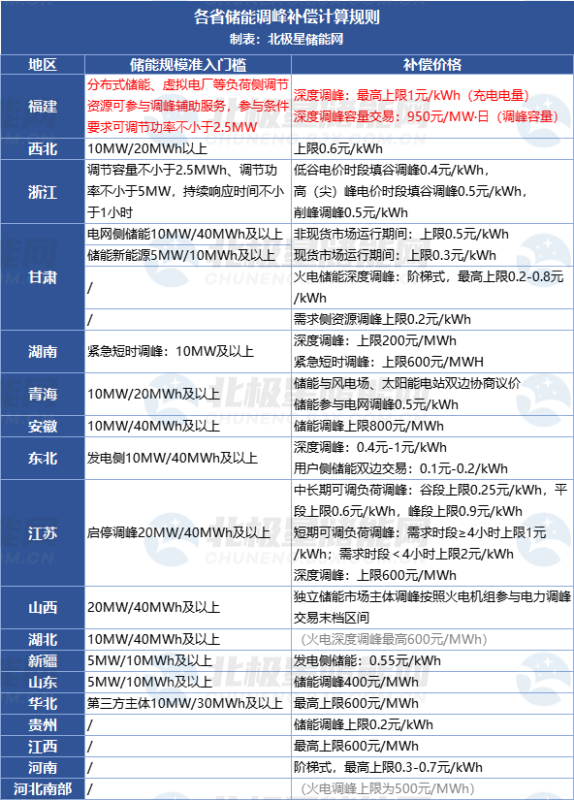 各省儲(chǔ)能調(diào)峰補(bǔ)償計(jì)算規(guī)則如下: