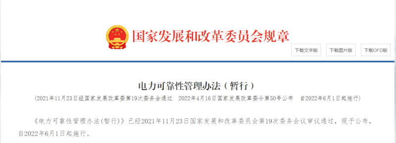 《電力可靠性管理辦法(暫行)》已經(jīng)2021年11月23日國(guó)家發(fā)展和改革委員會(huì)第19次委務(wù)會(huì)議審議通過(guò),現(xiàn)予公布,自2022年6月1日起施行。
