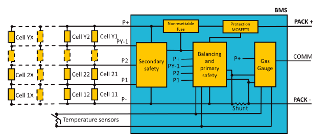 圖4顯示了一個(gè)典型的電池管理系統(tǒng)(BMS)示例。在這一設(shè)計(jì)中,每個(gè)電池單元(并聯(lián)電池組)的電壓由兩個(gè)獨(dú)立的組件(主要和次要安全)監(jiān)控。這兩個(gè)組件可以關(guān)閉放電或充電電流,熔斷不可復(fù)位的保險(xiǎn)絲或激活保護(hù)MOSFET。溫度和電流(通過(guò)分流器測(cè)量)也受到監(jiān)控,如果溫度或電流超出電池的推薦電流和溫度范圍,安全組件可以中斷電流。