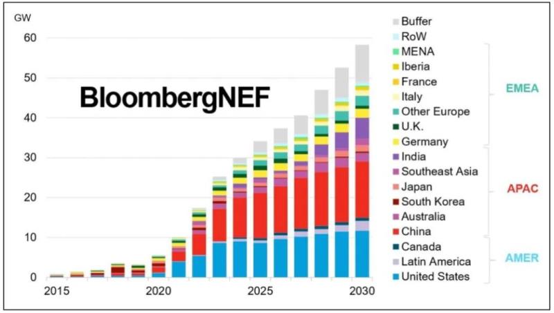 可再生能源接入電網(wǎng)需求的提升和極端事件發(fā)生頻率的增加將使儲能成為電力系統(tǒng)的關(guān)鍵要素。全球儲能市場正以前所未有的速度增長。根據(jù)研究機(jī)構(gòu)HIS Markit公司的預(yù)測,2022年全球部署的儲能系統(tǒng)總裝機(jī)容量將超過12吉瓦。根據(jù)國際可再生能源署(IRENA)的預(yù)測,到2030年全球儲能裝機(jī)將達(dá)到230吉瓦以上。根據(jù)彭博新能源財經(jīng)(BNEF)的預(yù)測,全球2030年新增儲能裝機(jī)容量將達(dá)到58吉瓦/178吉瓦時,是2021年創(chuàng)紀(jì)錄值的五倍多。