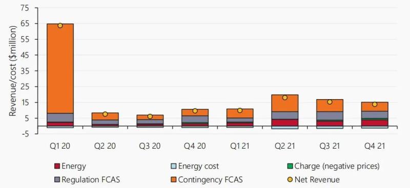 從近兩年儲能在NEM中的收益來源看,調(diào)頻和輔助服務(wù)(FCAS)市場仍是大型電池儲能系統(tǒng)的主要收入來源。BNEF數(shù)據(jù)顯示,2020年,澳大利亞儲能參與FCAS市場的盈利能力得到了很好的證明,占市場總收入的99%。另據(jù)AEMO數(shù)據(jù),2021年第四季度澳大利亞電池儲能凈營收(即扣去能量成本之后)為1400萬美元,其中FCAS收益占總營收的68%。