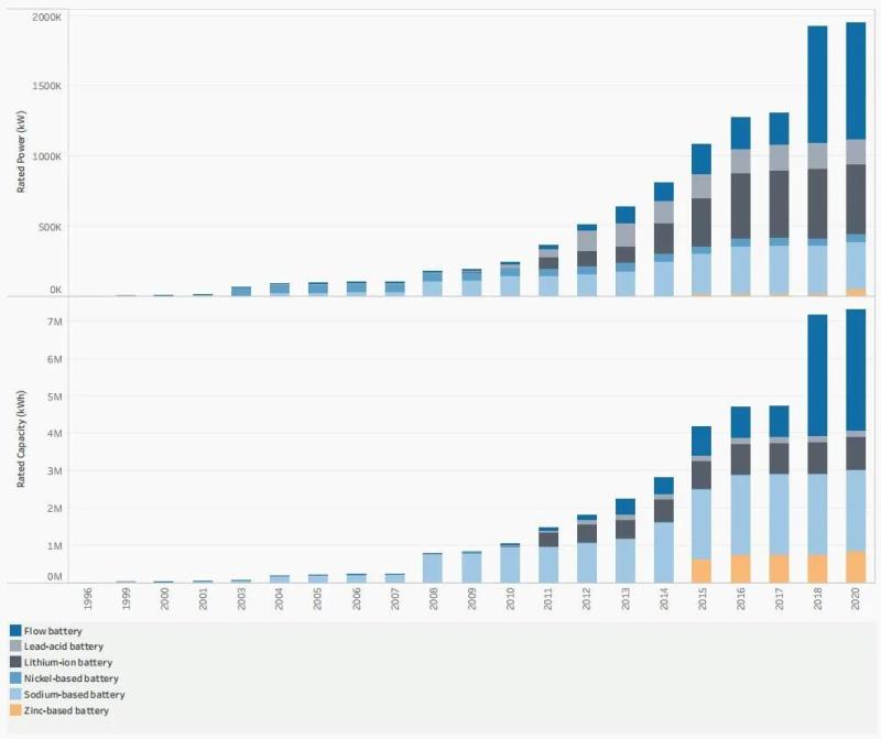 圖2 全球在運(yùn)電化學(xué)儲能項(xiàng)目裝機(jī)變化情況
