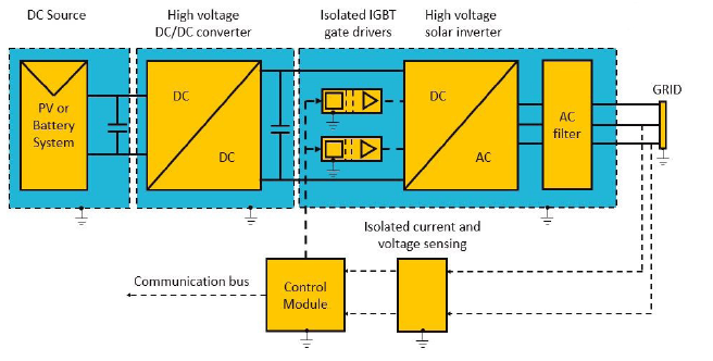 第7節(jié)中涵蓋的安全標(biāo)準(zhǔn)適用于充電器/逆變器。通常情況下,在這些簡(jiǎn)單的DC到AC(例如太陽(yáng)能發(fā)電設(shè)施)應(yīng)用中使用的逆變器是“無(wú)變壓器”的,這意味著該單元的DC-DC側(cè)和AC逆變器側(cè)之間沒(méi)有物理分離。與其相反,安全隔離是通過(guò)隔離交流逆變器的控制(例如IGBT類(lèi)型設(shè)備的柵極信號(hào))以及電壓和電流傳感器來(lái)提供的。與控制器的通信(例如通過(guò)CAN或以太網(wǎng))也可以完全隔離,但為清楚起見(jiàn),從下面的框圖中省略(參見(jiàn)圖5)。