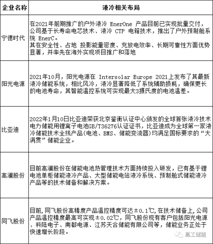 目前,國(guó)內(nèi)幾大儲(chǔ)能/溫控巨頭進(jìn)行了前瞻性布局,“玩家”囊括了寧德時(shí)代、陽(yáng)光電源、高瀾股份、同飛股份、比亞迪等,龍頭示范效應(yīng)將驅(qū)動(dòng)液冷滲透加速。