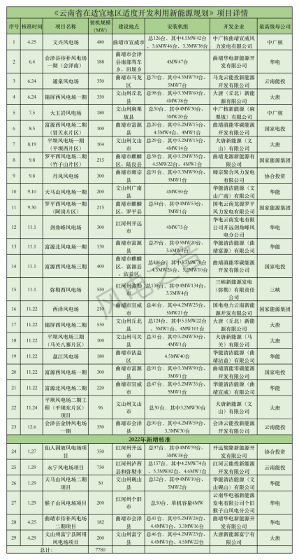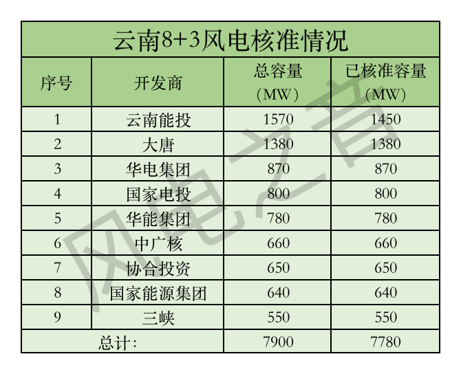 據(jù)「風(fēng)電之音」統(tǒng)計(jì),隨著4月29日云南省發(fā)改委公布文山州富寧縣阿用風(fēng)電場(chǎng)項(xiàng)目核準(zhǔn)批復(fù),云南“8+3”風(fēng)電項(xiàng)目已累計(jì)核準(zhǔn)7780MW,僅剩120MW風(fēng)電項(xiàng)目待核準(zhǔn)。