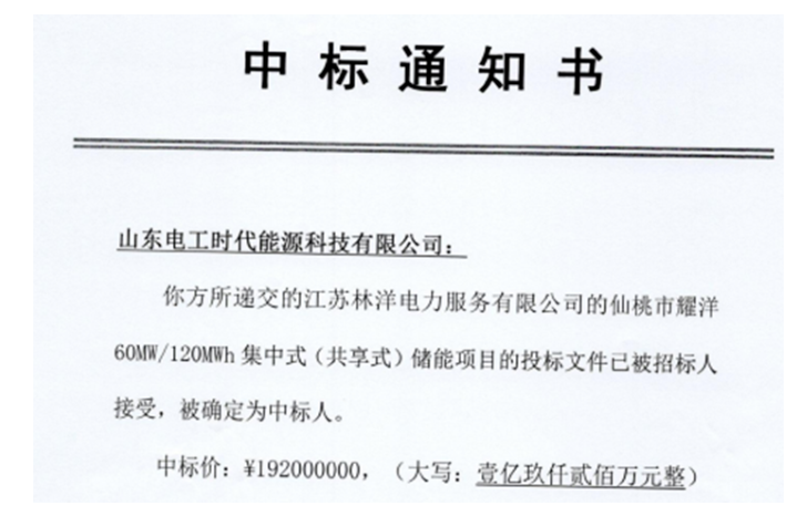 中國(guó)儲(chǔ)能網(wǎng)訊:4月24日,山東電工時(shí)代能源科技有限公司(以下簡(jiǎn)稱“電工時(shí)代”)中標(biāo)仙桃市耀洋60MW/120MWh集中式(共享式)儲(chǔ)能項(xiàng)目,中標(biāo)金額1.92億元,儲(chǔ)能業(yè)績(jī)累計(jì)突破1GWh!