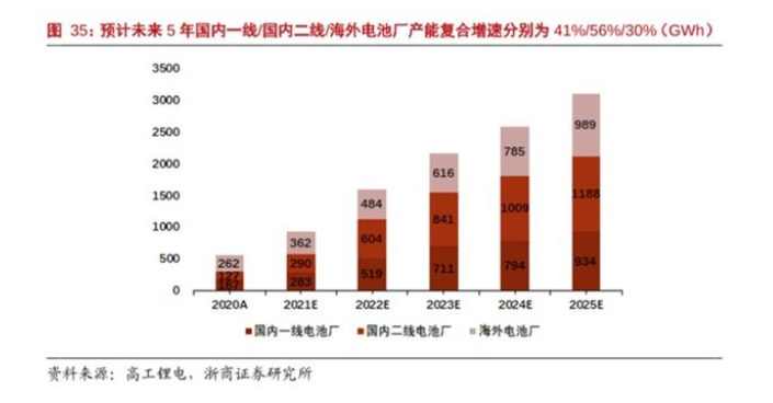 2021年二線電池廠紛紛公布擴(kuò)產(chǎn)計(jì)劃。浙商證券根據(jù)公開資料整理預(yù)測,和國內(nèi)一線電池廠以及海外電池廠相比,國內(nèi)二線電池廠2021-2025年的產(chǎn)能復(fù)合增速最快,可達(dá)56%。欣旺達(dá)、億緯鋰能、國軒高科、孚能科技、中創(chuàng)新航2025年產(chǎn)能預(yù)計(jì)可達(dá)140GWh、200GWh、300GWh、100GWh、500GWh。