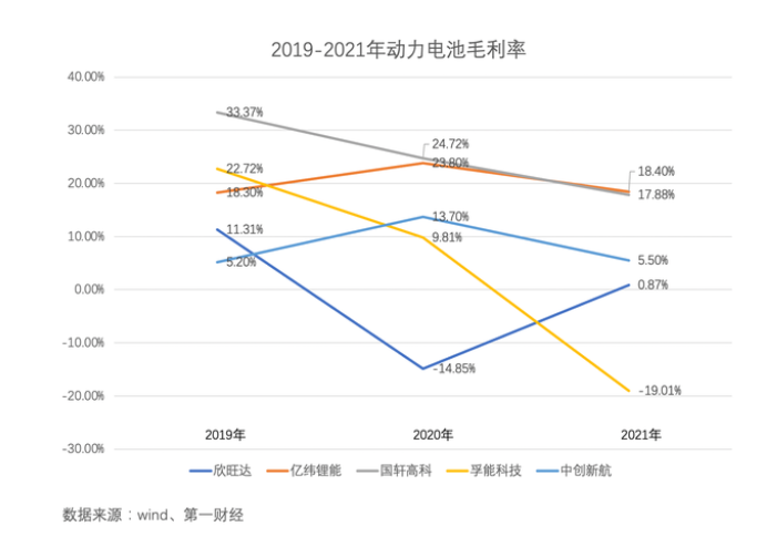 通聯(lián)數(shù)據(jù)datayes!顯示,受“蔚小理”青睞的欣旺達(dá)2019-2021年動力電池收入為8.49億、4.28億、29.33億元,僅占公司總營收的3.36%、1.44%、7.85%,毛利率分別為11.31%、-14.85%、-0.87%。同期公司手機(jī)數(shù)碼類產(chǎn)品的毛利率分別為17.06%、18.24%、18.39%,可見動力電池業(yè)務(wù)仍在“拖后腿”。