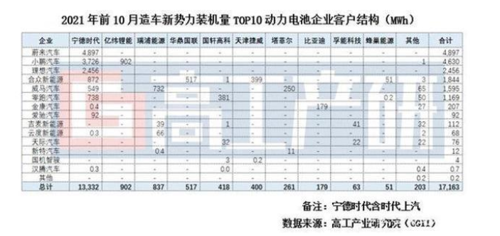 資料顯示,此前寧德時代一直是蔚來的獨(dú)家供應(yīng)商,其中70KWh、80KWh項(xiàng)目由寧德供應(yīng)模組,75KWh、100KWh項(xiàng)目供應(yīng)整包;小鵬方面,寧德時代是主力供應(yīng)商,2021年供應(yīng)占比超80%;理想的各主力車型電池也是由寧德時代獨(dú)供。