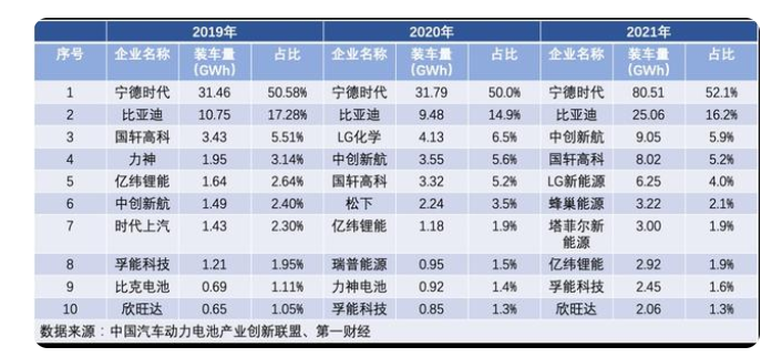 其中,國軒高科從2019的第三名略降至2021年第四名;億緯鋰能排名連續(xù)三年下滑,2019-2020年分別為第五、第七、第八(并列第七)位;孚能科技市場份額則從2019年的1.95%降為2021年的1.69%;欣旺達(dá)2020年沒有擠入前十,但2021年的裝車量占比較2019年提升了0.25個百分點(diǎn);中創(chuàng)新航則穩(wěn)步發(fā)展,市場份額實(shí)現(xiàn)三連升,到2021年一躍成為全國裝機(jī)量第三名。
