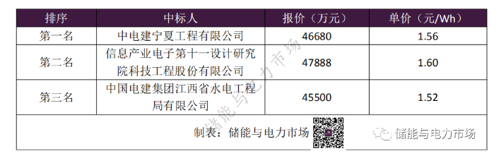 中國儲能網(wǎng)訊:5月6日,寧夏所屬風(fēng)電、光伏配套150MW/300MWh儲能項目EPC總承包工程發(fā)布中標公告,中電建寧夏工程有限公司以46680萬元(折合單價1.56元/Wh)的報價成為第一候選人。
