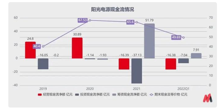 凈利潤的糟糕在現(xiàn)金流中還被進一步放大,為公司輸血的經(jīng)營活動現(xiàn)金流2021年成為負數(shù),足足流出了16.4億元之多,2022年一季度又流出了16.8億元。經(jīng)營的持續(xù)拉跨,加上仍在繼續(xù)的大手筆投資,讓2021年籌資凈流入超過50億的陽關(guān)電源不可避免地迎來了現(xiàn)金及等價物大幅收緊的情況。