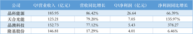據(jù)PV-tech數(shù)據(jù)顯示,2022年一季度,晶科能源、天合光能、晶澳科技、隆基股份排名組件出貨量TOP4,除隆基股份因為美國扣押組件以及自身調(diào)整影響出貨外,晶科能源、天合光能、晶澳科技三家企業(yè)營收、凈利潤增長幅度均在60%以上,晶澳科技期內(nèi)凈利增幅甚至高達378.27%。