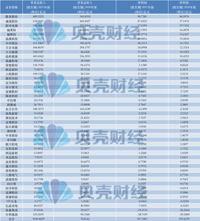 Wind統(tǒng)計,申萬光伏設(shè)備行業(yè)的46家上市企業(yè)共實現(xiàn)營收5100.5億元,同比2020年增長44.7%;實現(xiàn)凈利潤417.3億元,同比增長63.3%。2020年,這46家企業(yè)的營收和凈利潤對應分別是3524.6億元和255.6億元。