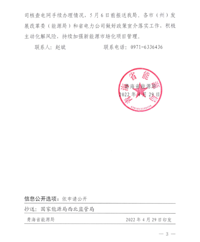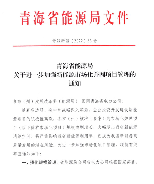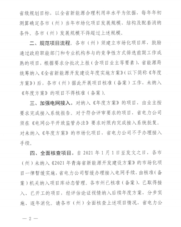 同時(shí),文件還進(jìn)一步規(guī)范了項(xiàng)目流程,全面核查項(xiàng)目。自2021年1月1日發(fā)文之日,各市州未納入《2021年青海省新能源開(kāi)發(fā)建設(shè)方案》(的市場(chǎng)化項(xiàng)目一律暫緩實(shí)施,省電力公司暫緩辦理接入電網(wǎng)手續(xù),由核準(zhǔn)機(jī)關(guān)納入項(xiàng)目庫(kù)動(dòng)態(tài)管理。各市州已核準(zhǔn)、已取得接入、已開(kāi)工項(xiàng)目,經(jīng)評(píng)估論證視情況納入后續(xù)年度方案,分步實(shí)施、逐年消化。