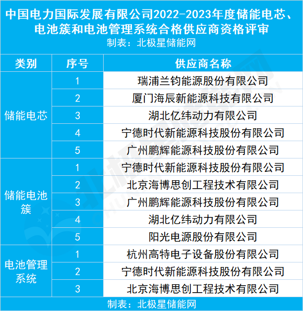 中國(guó)儲(chǔ)能網(wǎng)訊:4月28日,中國(guó)電力國(guó)際發(fā)展有限公司2022-2023年度儲(chǔ)能電芯、電池簇和電池管理系統(tǒng)合格供應(yīng)商資格評(píng)審結(jié)果公布。共有8家企業(yè)為別入圍電芯、電池簇、BMS三項(xiàng)目,而寧德時(shí)代同時(shí)入圍中標(biāo)三項(xiàng)成為最大贏(yíng)家。