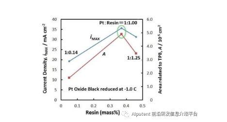 圖3. 在-1.0C電量下電化學(xué)還原后的Pt Oxide Black的氨氧化電流以及三相界面相關(guān)面積與催化層中陰離子交換樹(shù)脂含量的關(guān)系