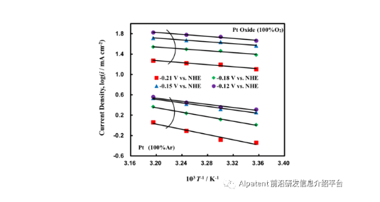 圖1. Pt薄膜與在-0.4C電量下進(jìn)行電化學(xué)還原后的Pt氧化物薄膜的氨氧化電流與溫度的關(guān)系