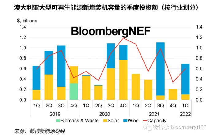 彭博新能源財經(jīng)估計,2022年第一季度,澳大利亞大型可再生能源新增裝機容量獲得投資6.94億美元(9.5億澳元)——繼2021年第四季度微弱增長后,該季度環(huán)比增幅達到233%,且在2021年第一季度基礎上同比增長38%。據(jù)估計,屋頂光伏等小型分布式裝機容量獲得投資8.05億美元。
