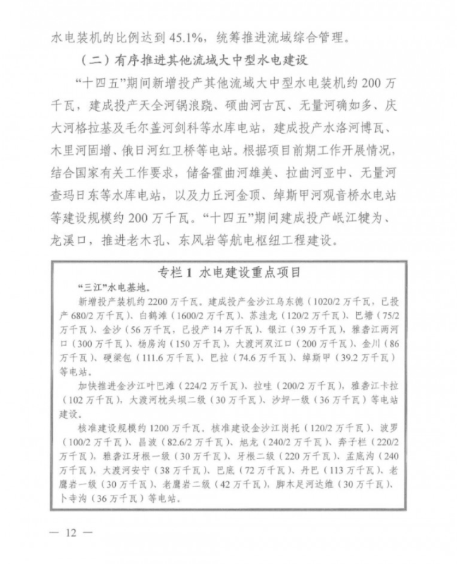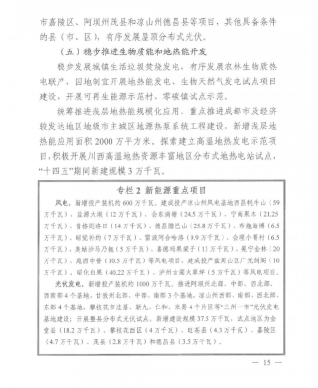規(guī)劃指出,“十四五”期間四川省將新增水電裝機(jī)約2400萬(wàn)千瓦、風(fēng)電約600萬(wàn)千瓦、光伏發(fā)電約1000萬(wàn)千瓦。重點(diǎn)推進(jìn)“三江”(金沙江、雅礱江、大渡河)水電基地、涼山州風(fēng)電基地、“三州一市”(阿壩州、甘孜州、涼山州、攀枝花市)光伏發(fā)電基地建設(shè)。