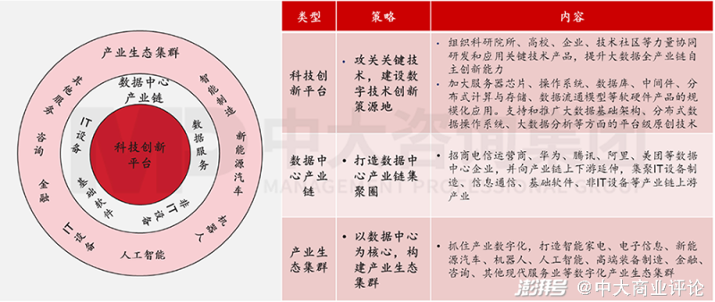 數(shù)據(jù)中心產(chǎn)業(yè)將依托產(chǎn)業(yè)園載體,圍繞科技創(chuàng)新平臺(tái)、產(chǎn)業(yè)鏈與關(guān)聯(lián)產(chǎn)業(yè)打造數(shù)據(jù)中心產(chǎn)業(yè)生態(tài)集群。以產(chǎn)業(yè)園區(qū)為載體,引入科研院所、高校、企業(yè)、技術(shù)社區(qū)等構(gòu)建科技創(chuàng)新平臺(tái),攻關(guān)關(guān)鍵技術(shù),建設(shè)數(shù)字技術(shù)創(chuàng)新策源地。建設(shè)數(shù)據(jù)中心基地,引入電信運(yùn)營(yíng)商、華為、騰訊、阿里等數(shù)據(jù)應(yīng)用服務(wù)企業(yè),向IT設(shè)備制造、信息通信、基礎(chǔ)軟件、非IT設(shè)備等產(chǎn)業(yè)鏈上下游產(chǎn)業(yè)延伸,打造數(shù)據(jù)中心產(chǎn)業(yè)鏈集聚圈。以數(shù)據(jù)中心為核心,抓住產(chǎn)業(yè)數(shù)字化趨勢(shì),打造由智能家電、電子信息、新能源汽車、機(jī)器人、人工智能、高端裝備制造、金融、咨詢、其他現(xiàn)代服務(wù)業(yè)等數(shù)字化產(chǎn)業(yè)生態(tài)集群。