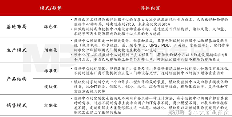 根據(jù)數(shù)據(jù)中心產(chǎn)業(yè)政策與商業(yè)模式變革趨勢(shì),數(shù)據(jù)中心產(chǎn)業(yè)市場(chǎng)規(guī)模擴(kuò)張、產(chǎn)業(yè)結(jié)構(gòu)優(yōu)化與高質(zhì)量發(fā)展的趨向?qū)⑼苿?dòng)數(shù)據(jù)中心向產(chǎn)業(yè)基地綠色化、生產(chǎn)模式預(yù)制化、產(chǎn)品標(biāo)準(zhǔn)化及模塊化、銷售模式定制化發(fā)展。