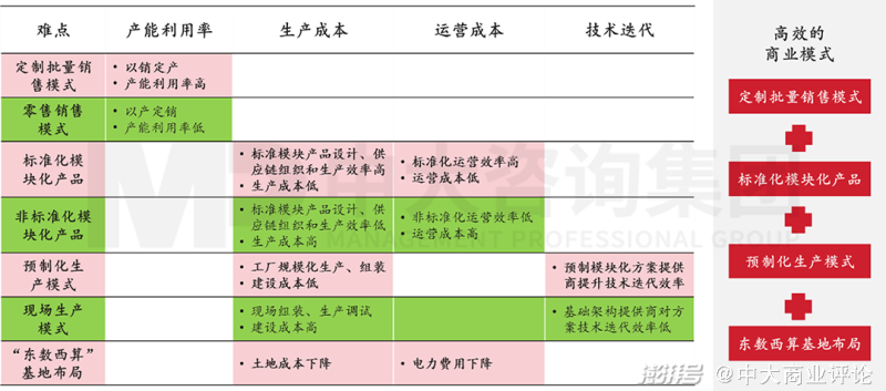 數(shù)據(jù)中心產(chǎn)業(yè)加速商業(yè)模式變革,“定制銷售+模塊化產(chǎn)品+預(yù)制化生產(chǎn)+東數(shù)西算基地布局”商業(yè)模式更利于解決行業(yè)難點(diǎn)與提升行業(yè)效率,商業(yè)模式競(jìng)爭(zhēng)優(yōu)勢(shì)將越加明顯。通過(guò)銷售模式、產(chǎn)品類型、生產(chǎn)模式和基地布局等不同模式對(duì)比,定制銷售模式的銷售效率和產(chǎn)能利用率由于零售模式,標(biāo)準(zhǔn)化、模塊化產(chǎn)品設(shè)計(jì)、生產(chǎn)和運(yùn)營(yíng)成本低于非標(biāo)準(zhǔn)模塊化產(chǎn)品,預(yù)制化生產(chǎn)模式實(shí)現(xiàn)規(guī)?;a(chǎn)、建設(shè)成本更低,“東數(shù)西算”基地布局利于降低土地和電力等建設(shè)運(yùn)營(yíng)成本。