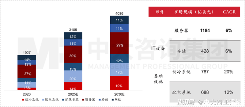“東數(shù)西算”工程為數(shù)據(jù)中心產(chǎn)業(yè)帶來(lái)重大利好,產(chǎn)業(yè)鏈將迎來(lái)蓬勃發(fā)展機(jī)遇。根據(jù)IDC預(yù)測(cè),2030年數(shù)據(jù)中心產(chǎn)業(yè)市場(chǎng)規(guī)模將達(dá)到4036億元,其中服務(wù)器、制冷系統(tǒng)、配電系統(tǒng)規(guī)模占比排名前三,是未來(lái)市場(chǎng)規(guī)模最大的領(lǐng)域。從增長(zhǎng)率來(lái)看,制冷系統(tǒng)與配電系統(tǒng)復(fù)合增長(zhǎng)率分別為20%與12%,市場(chǎng)增長(zhǎng)空間最為廣闊,也為相關(guān)企業(yè)帶來(lái)了巨大機(jī)遇。