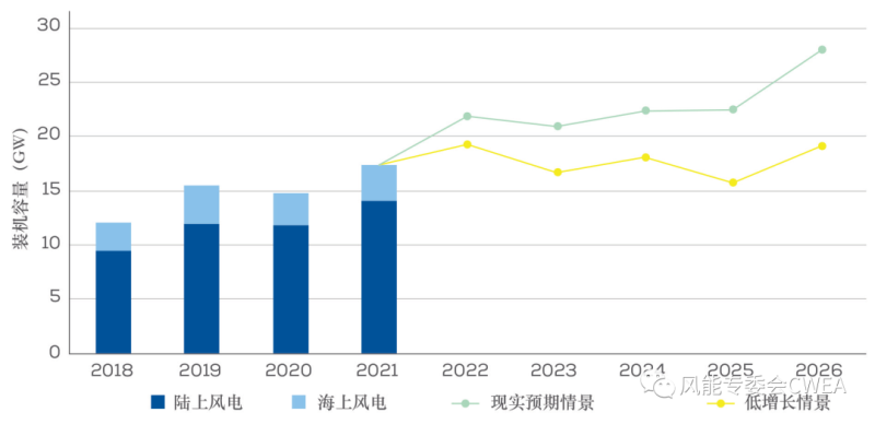 對(duì)比低增長(zhǎng)情景與現(xiàn)實(shí)預(yù)期情景,最大的差異發(fā)生在陸上風(fēng)電市場(chǎng)中,未來五年的合計(jì)新增裝機(jī)容量將相差22GW,這一點(diǎn)在2025年和2026年表現(xiàn)得尤為明顯。