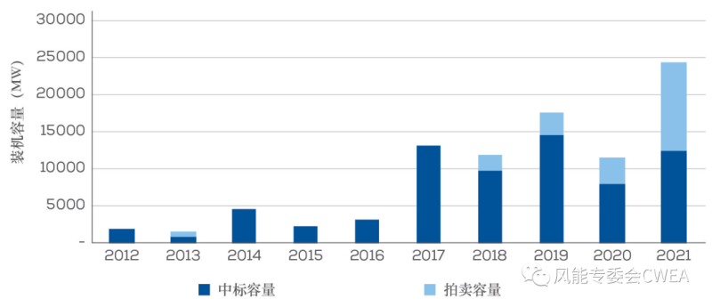 圖8 2012—2021年歐洲風(fēng)電拍賣與投標(biāo)情況